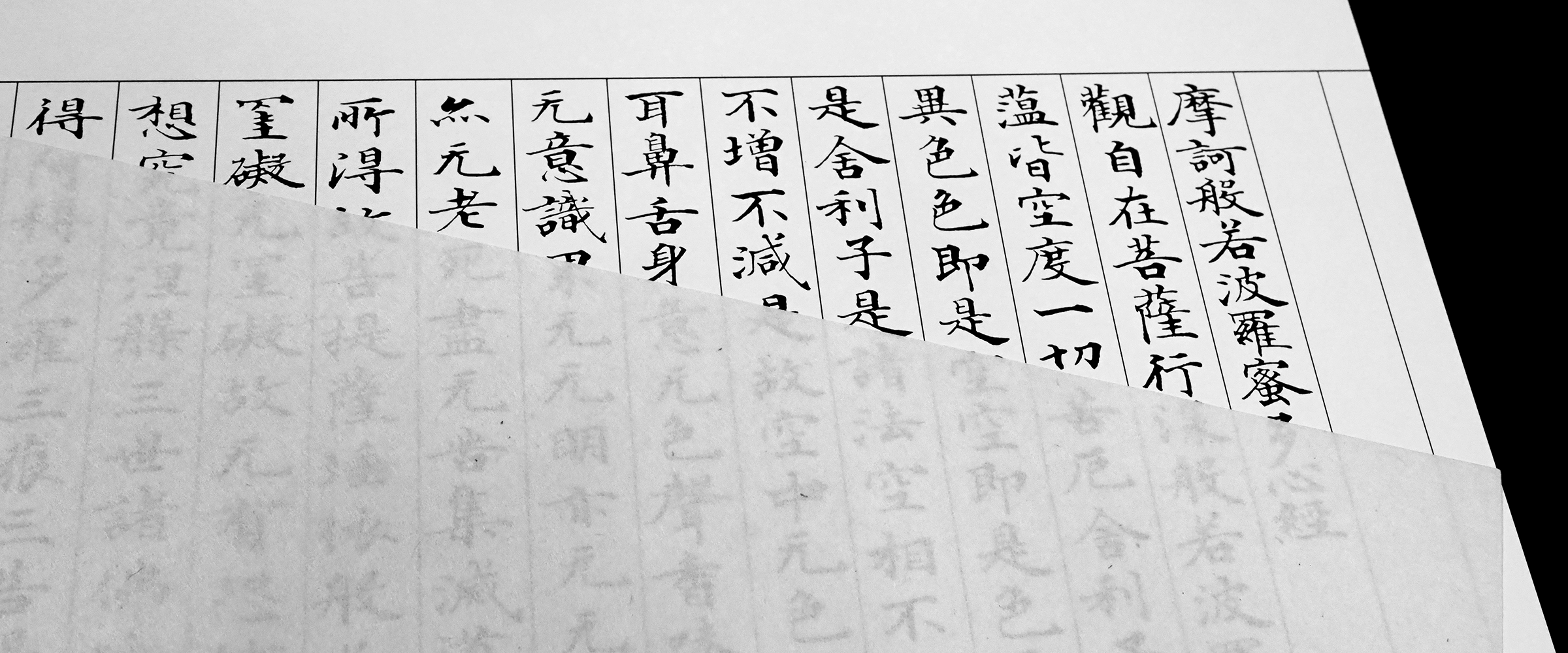 広く写経に用いられる「般若心経」を写経していただきます。「般若心経」は数ある教典の中で最も親しまれているお経であり、わずか266文字の中に仏教の神髄が語られています。お写経するのにもちょうど良い長さと言えるでしょう。お写経は祈りの実践であり、上手に書こうと思う必要はありません。一文字一文字を心を込めて書いてください。寳壽院ではお写経をするための写し用紙を用意しておりますので、その用紙の上を筆でなぞっていただきます。