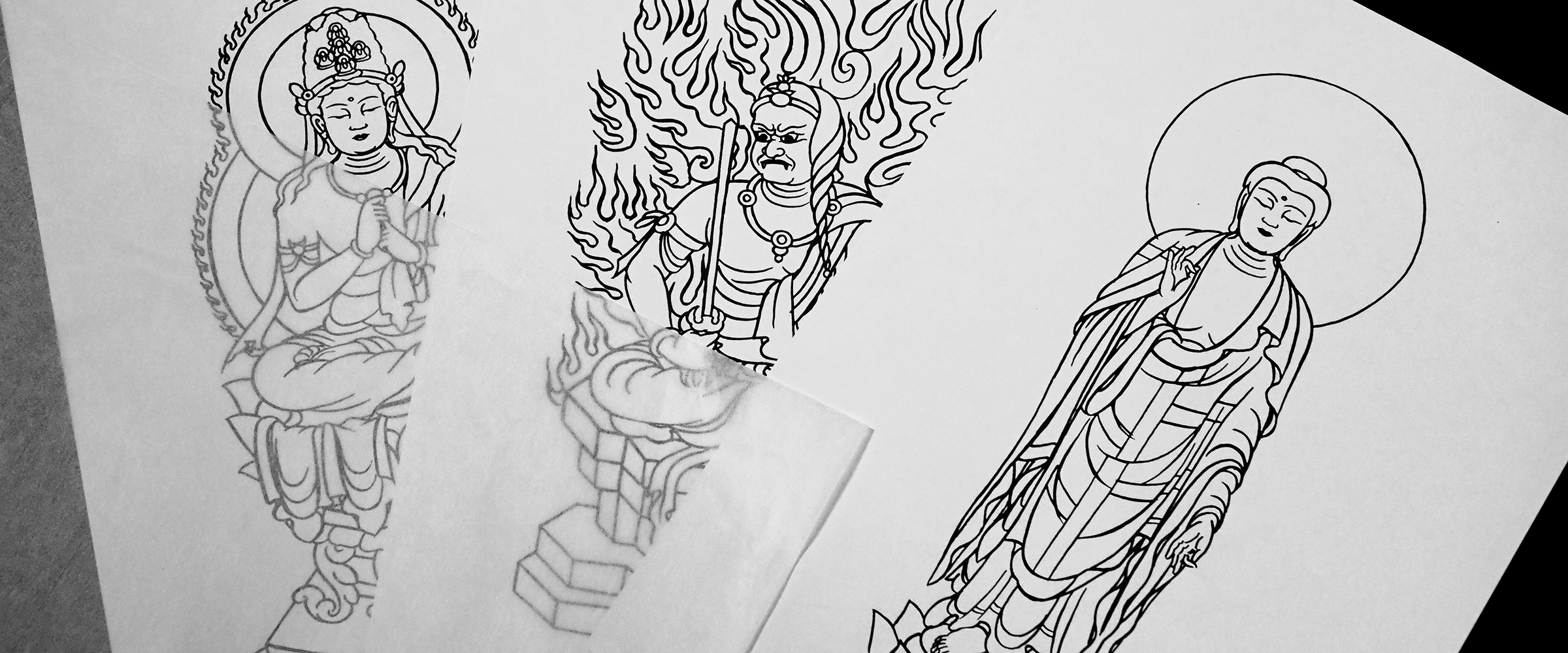 寳壽院の写仏には、大日如来・阿弥陀如来・不動明王・観音菩薩を描いた4種類のお手本があり、その中からお好きな仏様を選び、絵の線を筆でなぞり描いていきます。